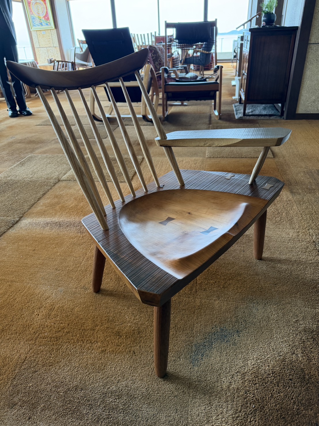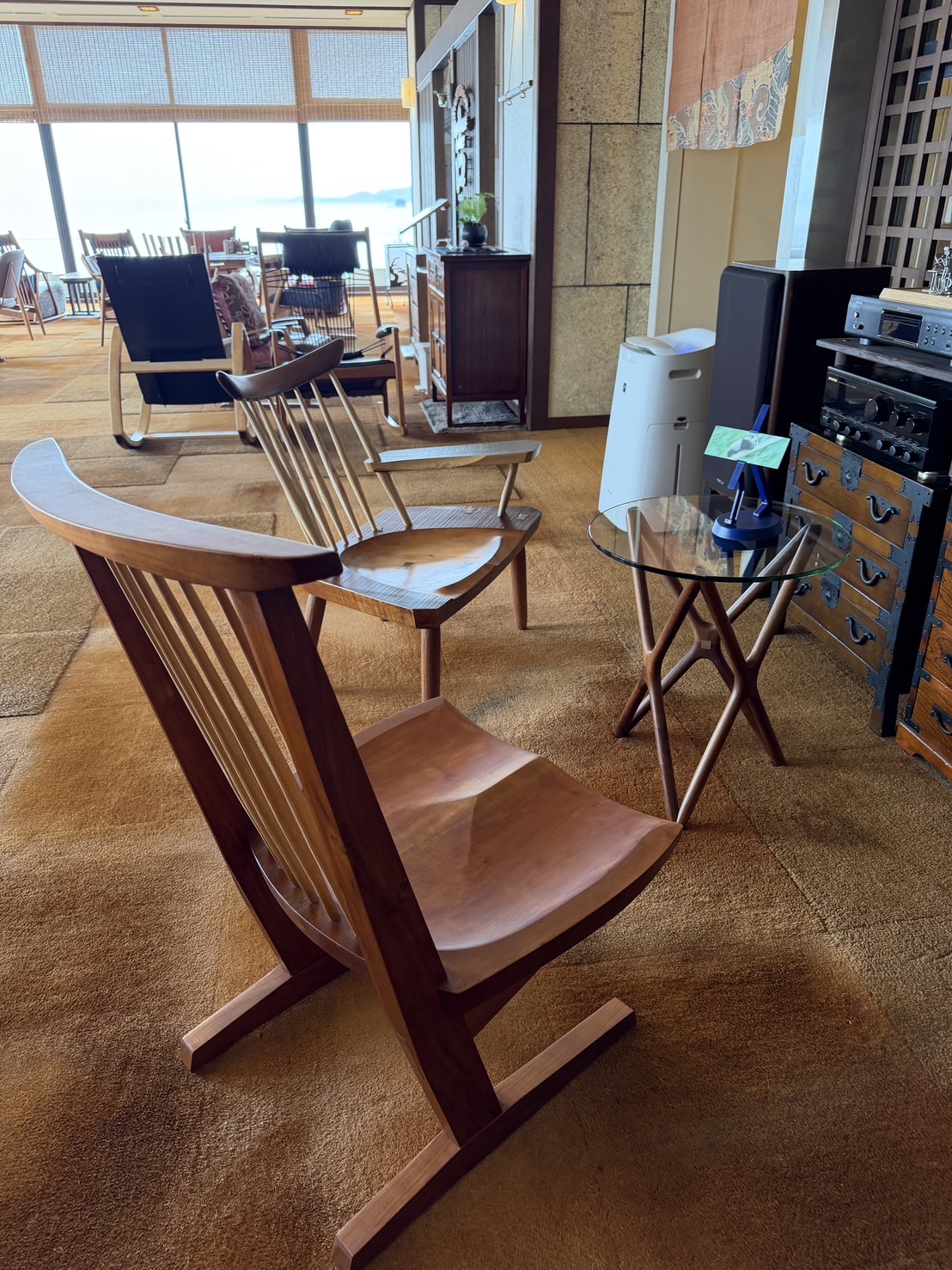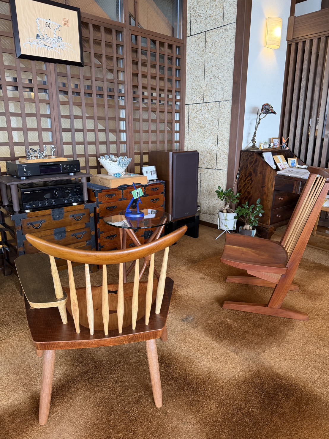 海が臨める落ち着いたロビーには、何年もかけて集められた様々な椅子が置かれており、その仲間に加えていただきました。