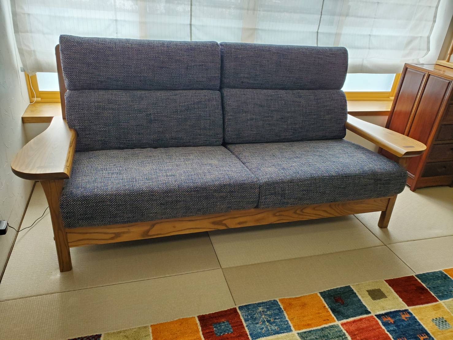 和室の空間には、柔らかな空色のギャッベとナラ材一枚板テーブルを納品させていただきました。