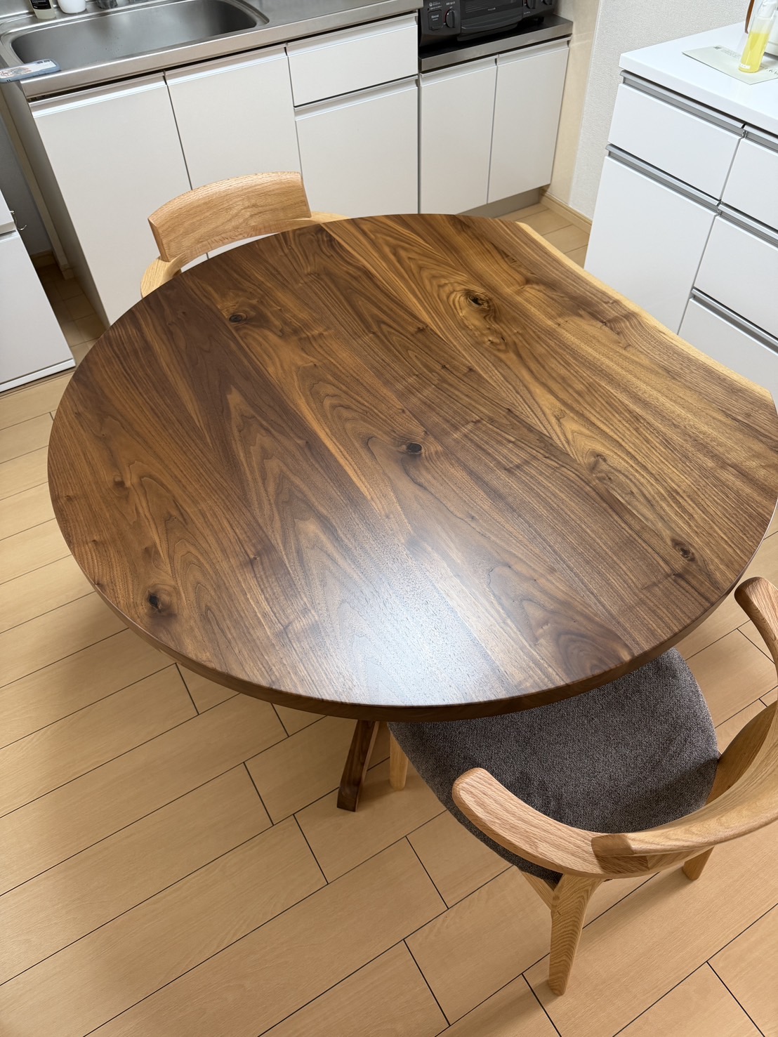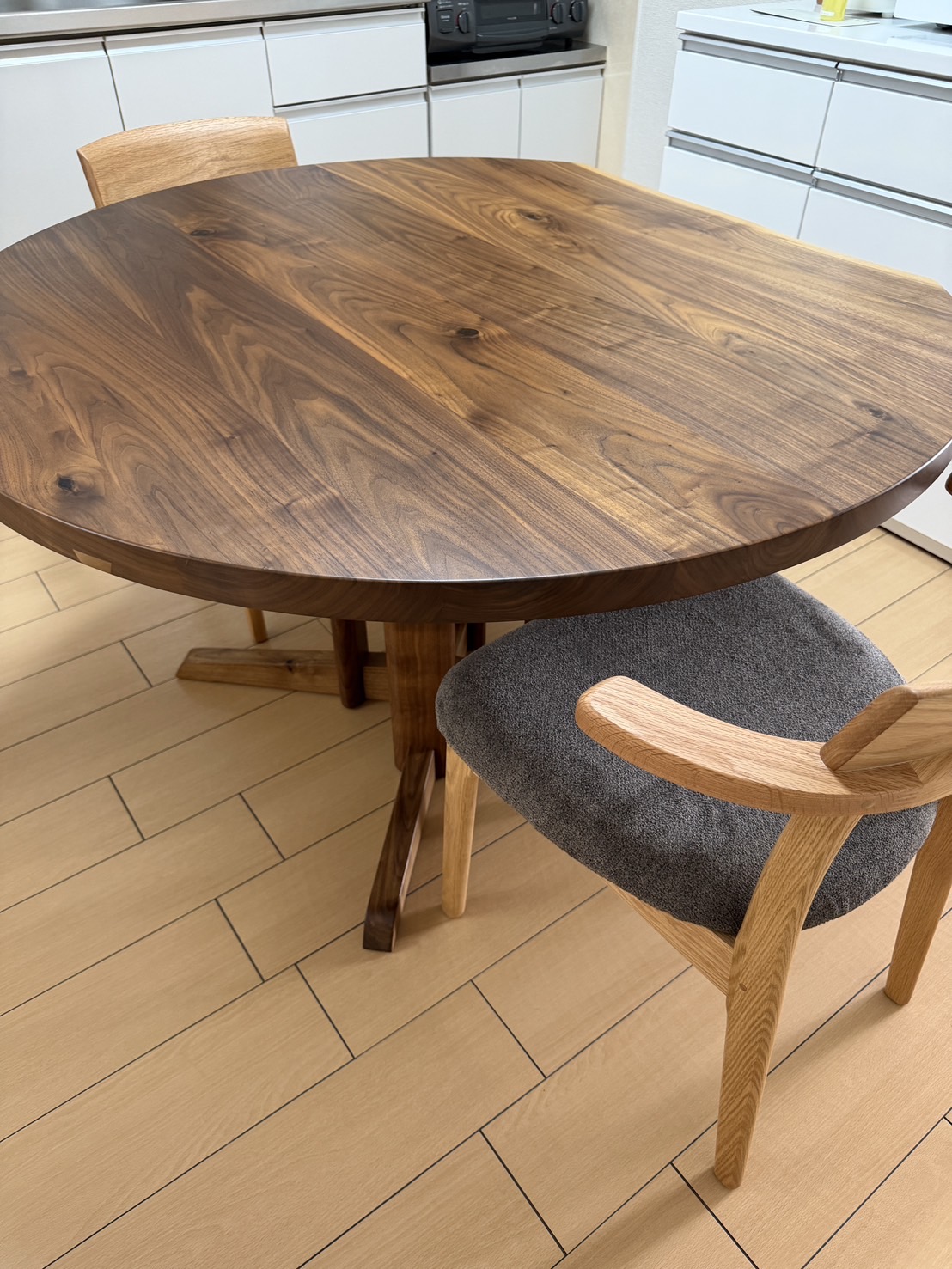 美しい木目のウォールナット材を円形のテーブルに仕上げました。