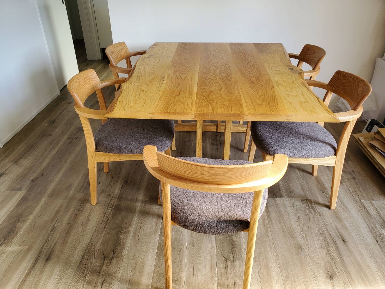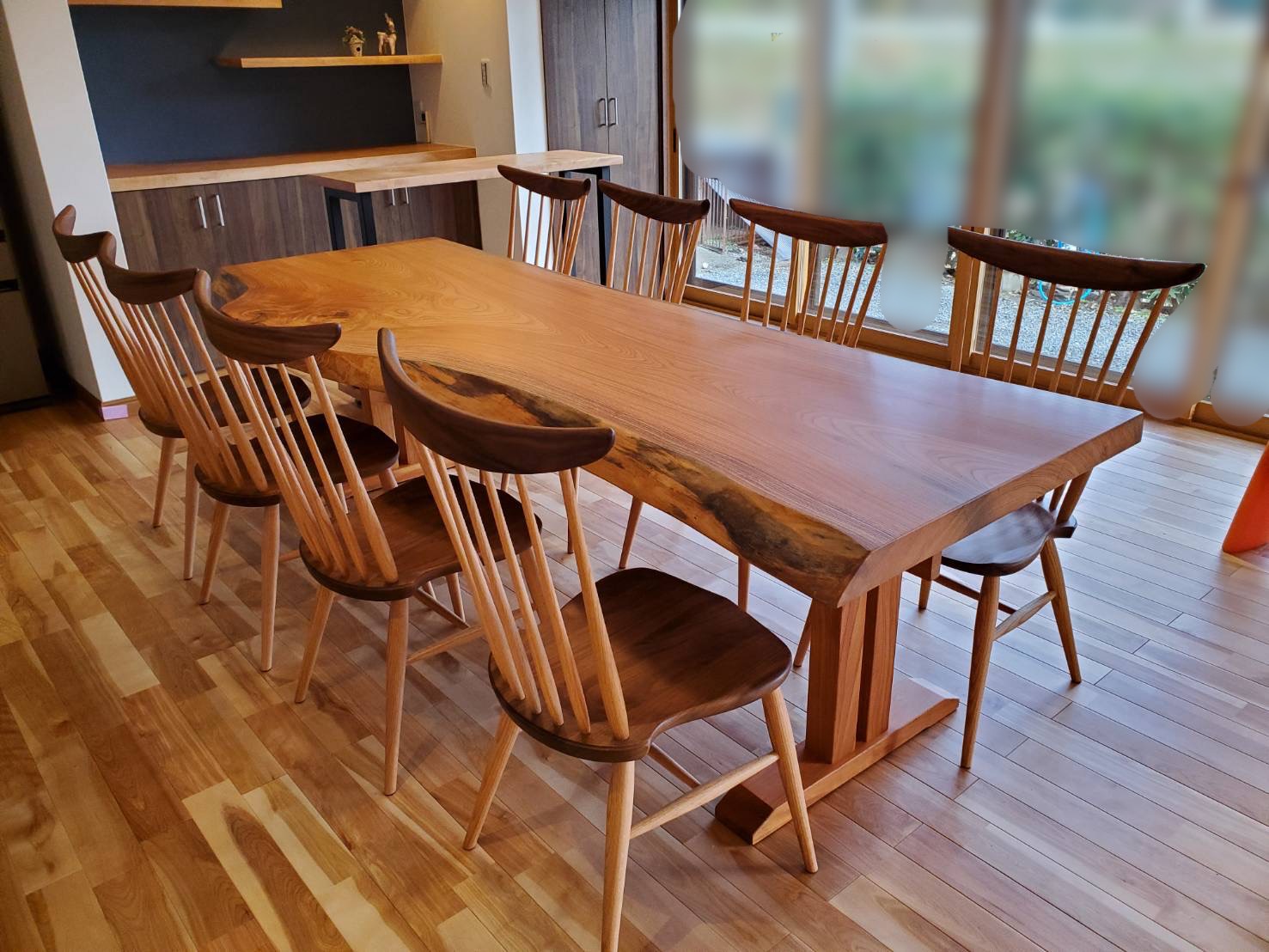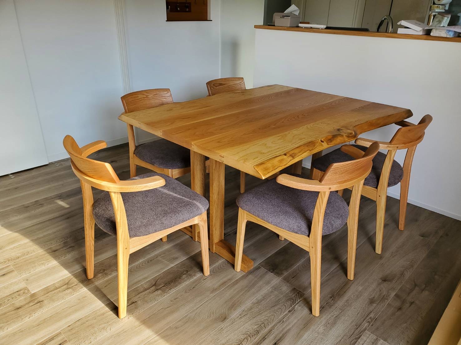 ダイニングセットの納品をさせていただきました。テーブルの天板には、お客様こだわりのチギリを入れたオーダー品です。
