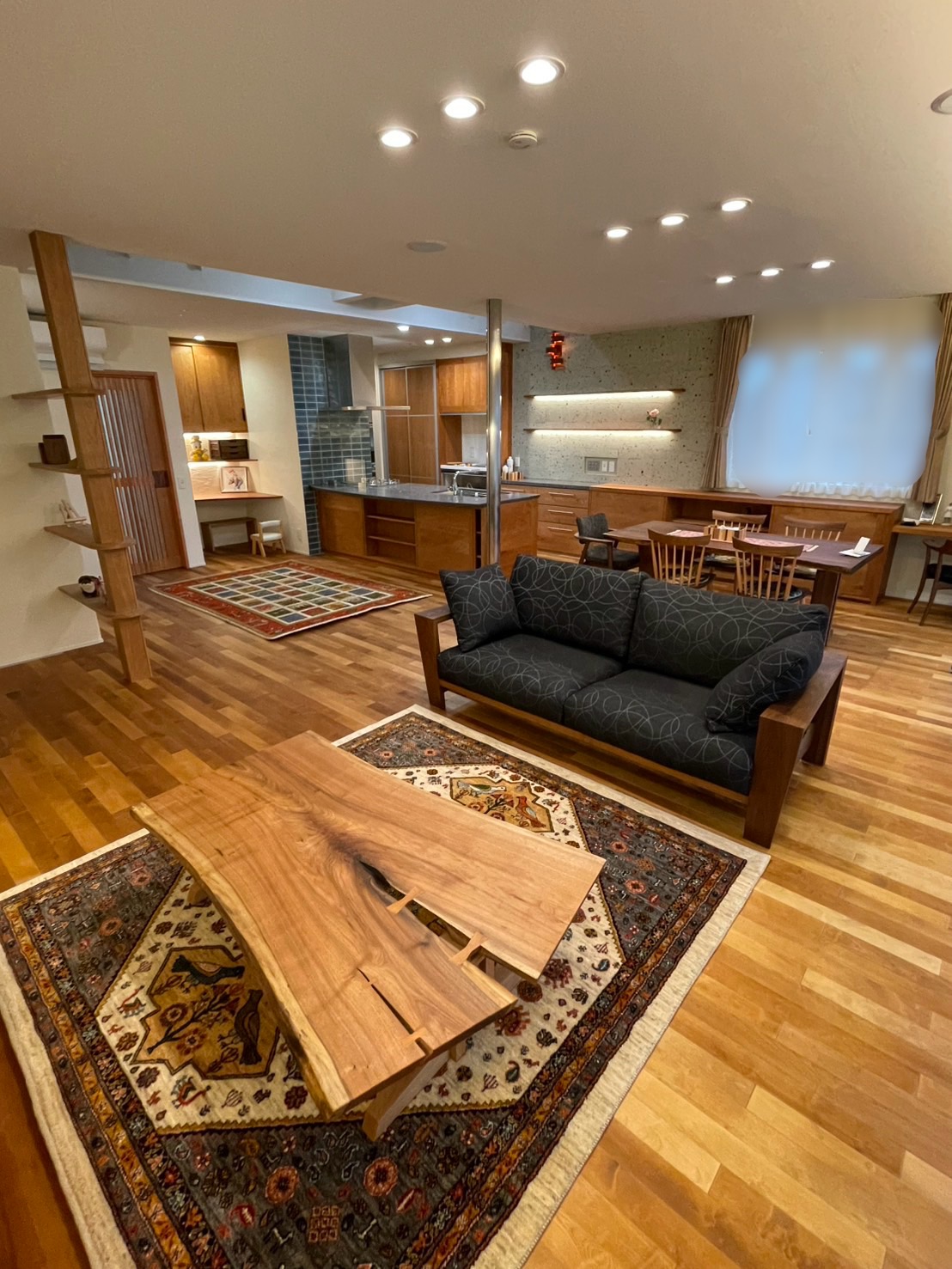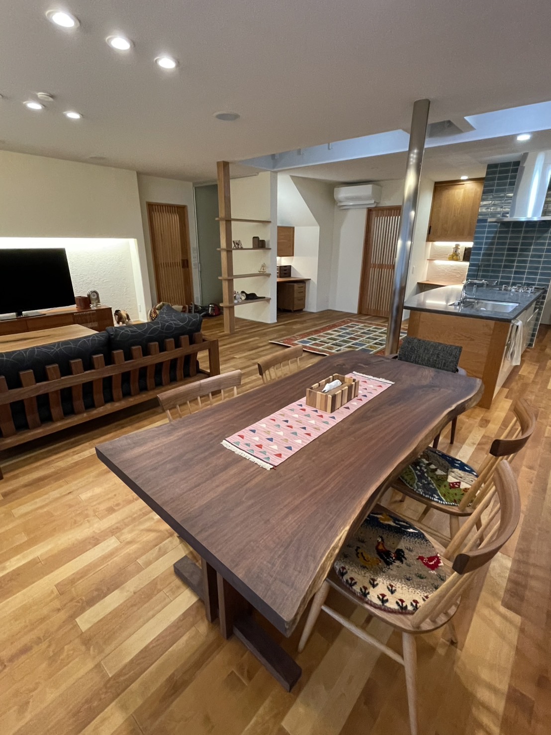 お持ちのケヤキ一枚板の座卓をダイニングにリメイクさせていただきました。
