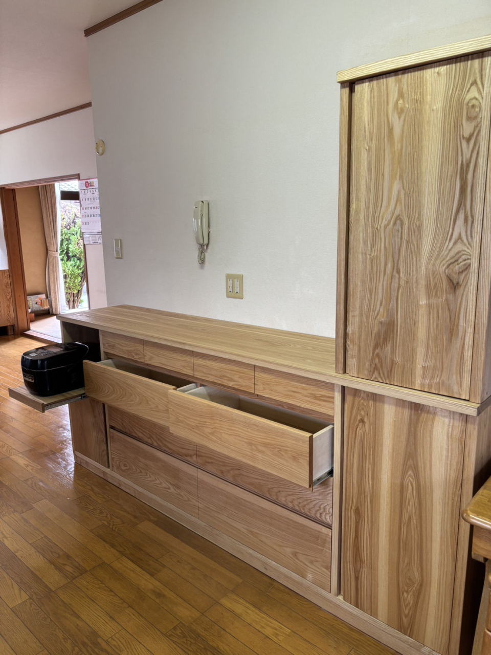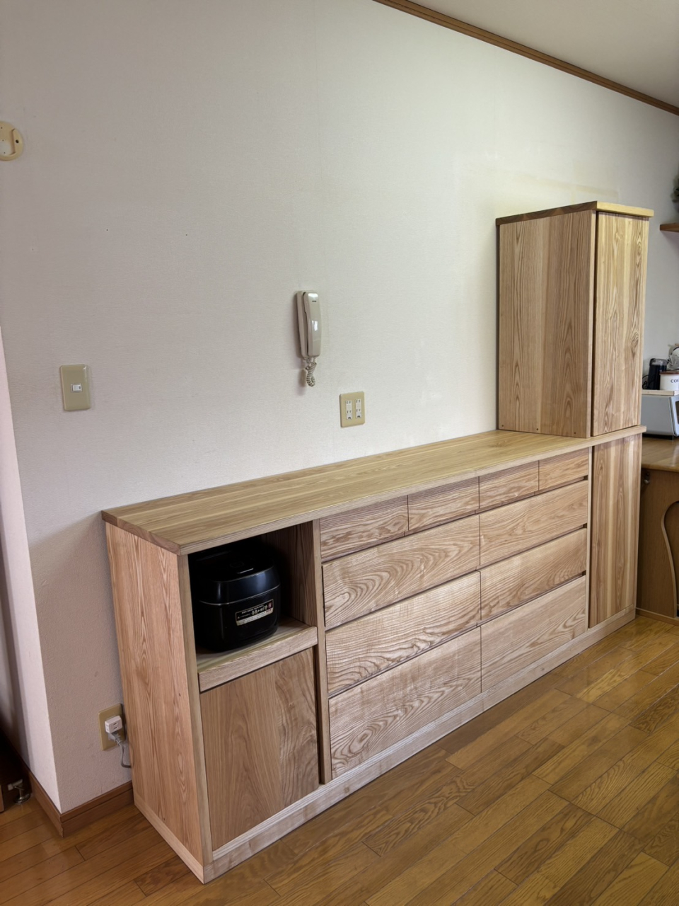 キッチンとリビングにタモ材でオーダーで制作したボードを配達させていただきました。