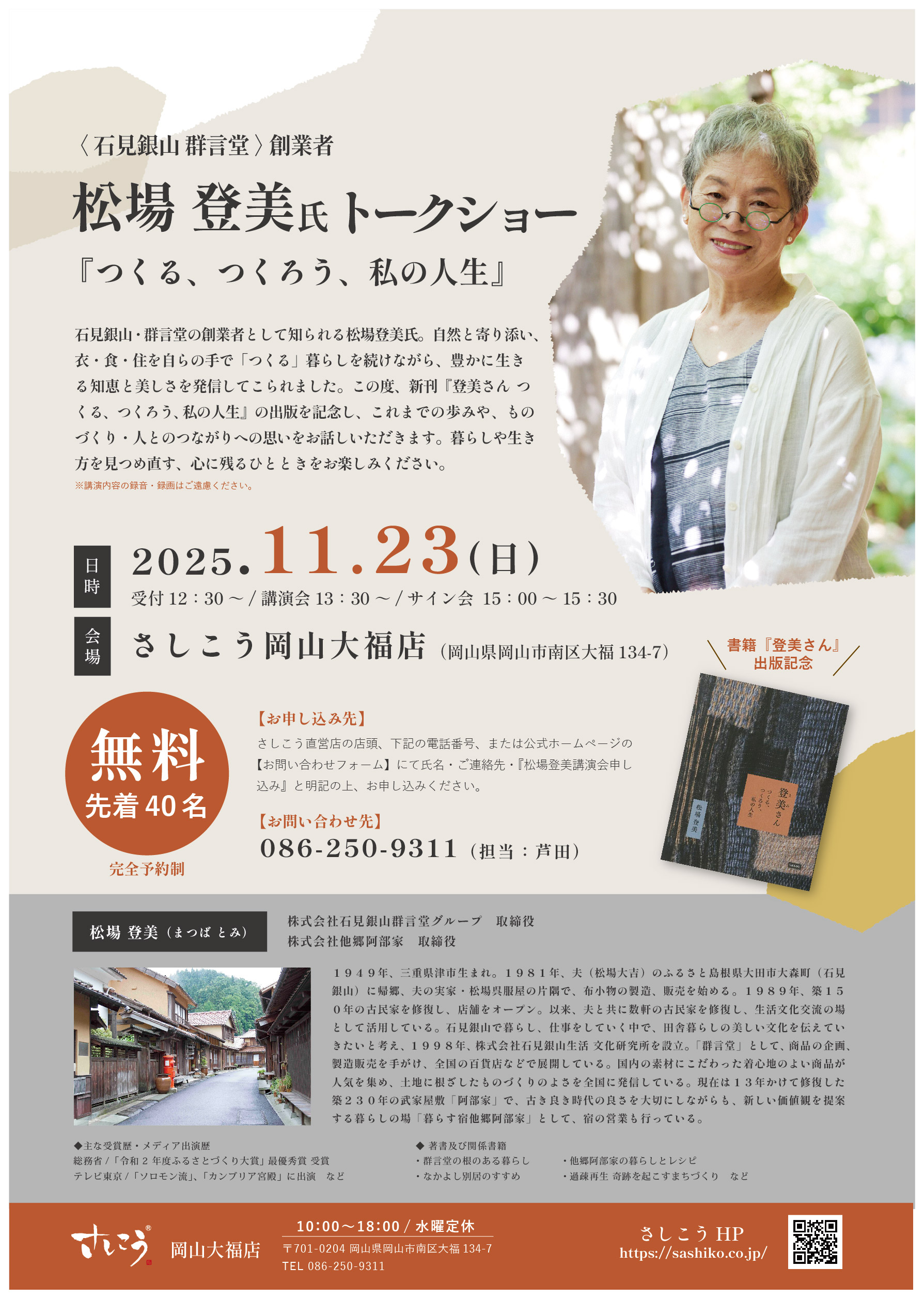 岡山大福店『松場登美氏トークショー ~つくる、つくろう、私の人生~』