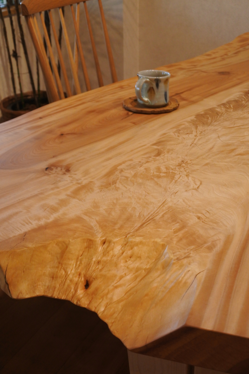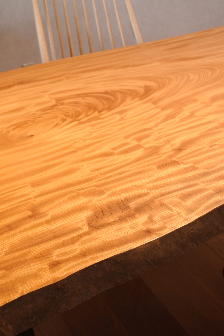 木目が重なるような、独特の美しい光沢のあるテーブル。迫力ある一枚です。