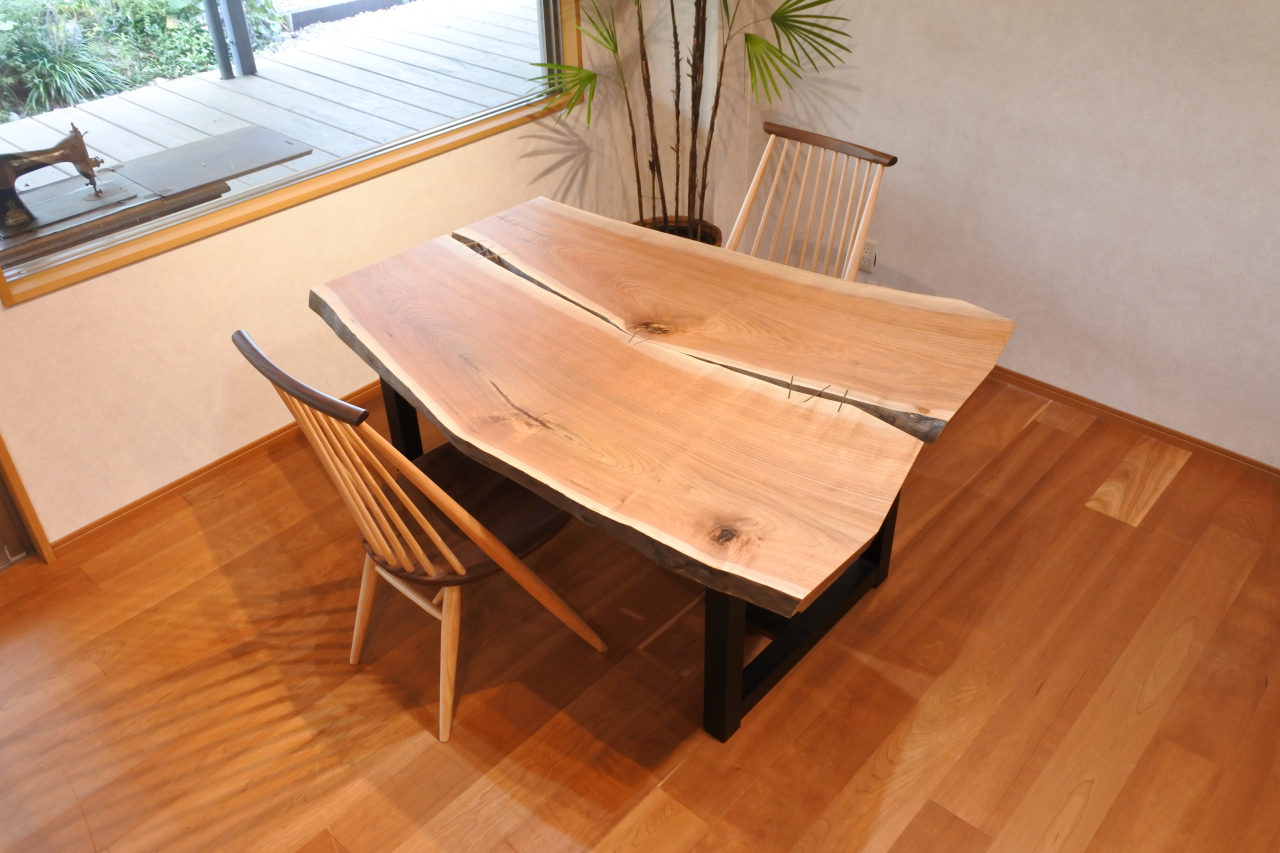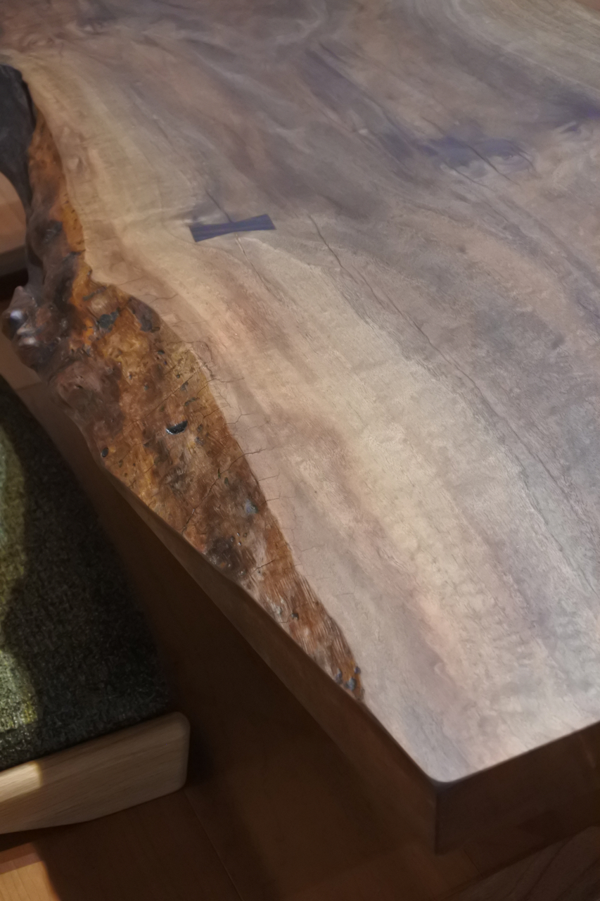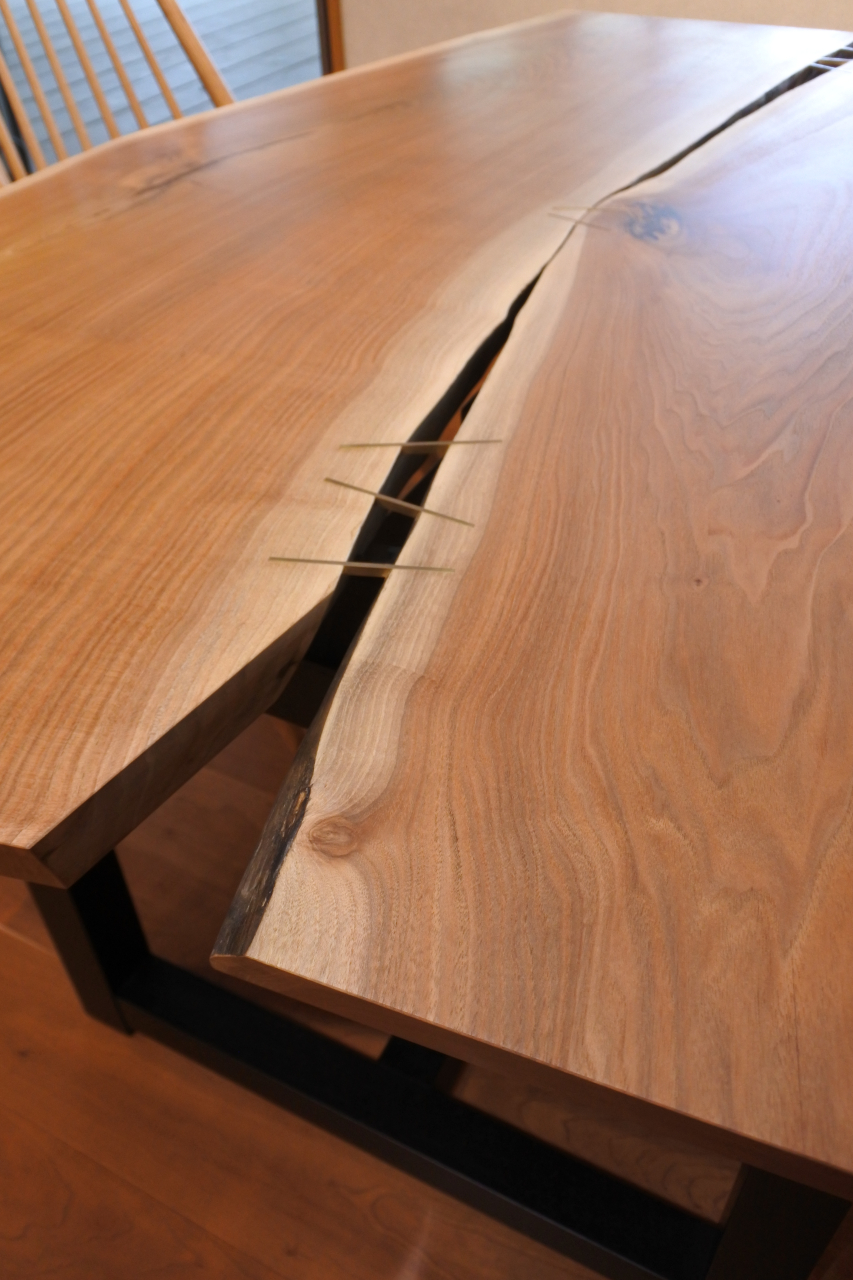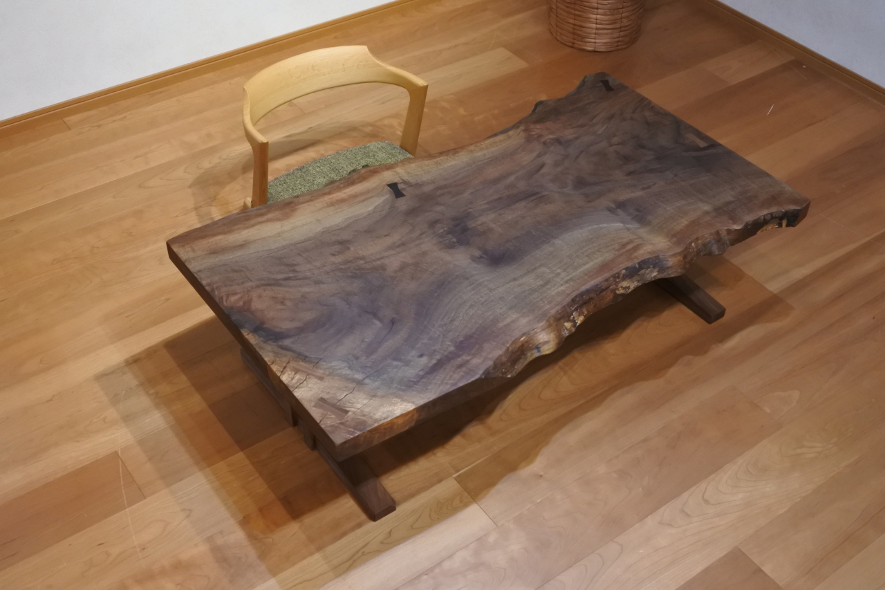 2枚のクルミの板を合わせたテーブル。個性的な形と真鍮のチギリがポイントです。